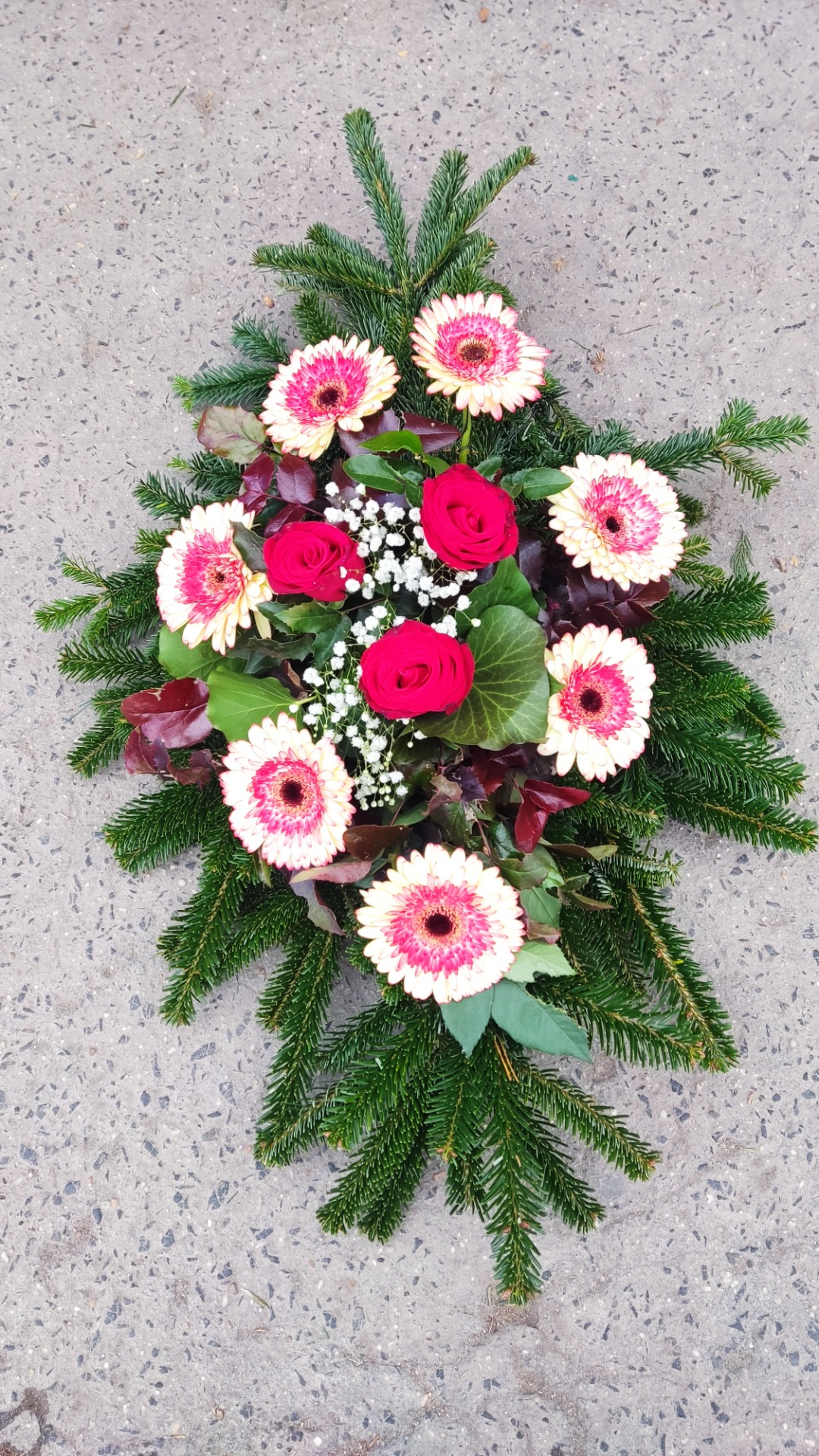 10 szálas sírcsokrainkat 2 fajta virágból készítjük. 7 szál (gerbera, szegfű, krizantém)+ 3 szál (rózsa). MÁS SZÍNBEN IS KÉRHETŐ!